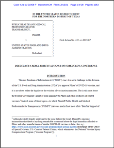 4. Regarding the hearing this week, the public will get to read the transcript when it is released, which we expect should be soon. In the meantime, it is noteworthy that the DOJ attorney who appeared without an FDA representative effectively argued that the American people and the plaintiff should just trust the FDA that it will produce documents as fast as possible even though it has now been over 110 days since the request was made to the FDA and it has produced on average only ~29 pages per day. The FDA also continued to maintain that it does not want the Court to require it to produce at a rate faster than 500 pages per month as it continued to harp on Pfizer’s interests and its trade secrets, for the most part ignoring the interests of the American people. For our part, we had the privilege of arguing many of the points that you can read below in our papers.