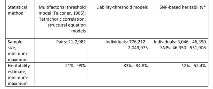 The “roughly in line with” is an appeal to consistency. But the Liability Threshold Models differ from other approaches methodologically. Previous studies, one of which was conducted by the same group of researchers, had estimates that ranged from 0 to 99% heritability. The average, until this group started using liability-threshold models, was around 40% attribution to genetics. Their studies increased the average, but it still hoveredaround 50% liability. Only the liability threshold models, used by this group, show results around 80% liability. So their method is consistent with itself. No surprise there. But that’s no where near “roughly in line” with all prior studies.