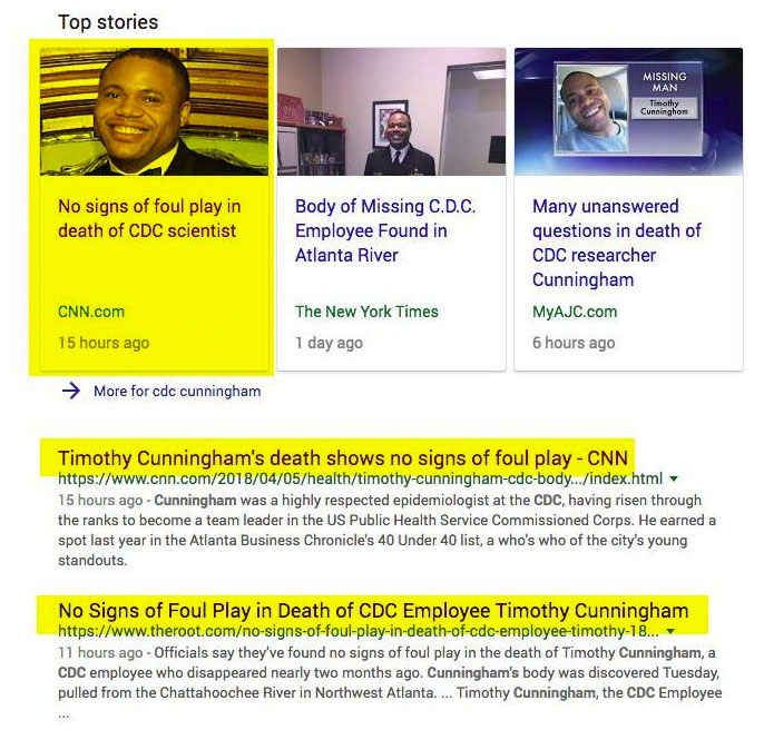 What happened to CDC employee and Team Lead of Population Health, Dr. Timothy J. Cunningham? His body was found along the muddy banks of the Chattahoochee River, a developed river park in northern metro Atlanta. He was missing for 7 weeks. He left his dog Bo, his keys, wallet, ID, and passport at his apartment and vanished. Local Atlanta police reported his disappearance as strange and out-of-the ordinary yet CNN and Google reported it as a drowning with “No Foul Play.” Does CNN think Dr. Cunningham went for a swim and drowned in February? I started to look for myself and discovered CNN was censoring some important information about the the company that makes the Zika virus.