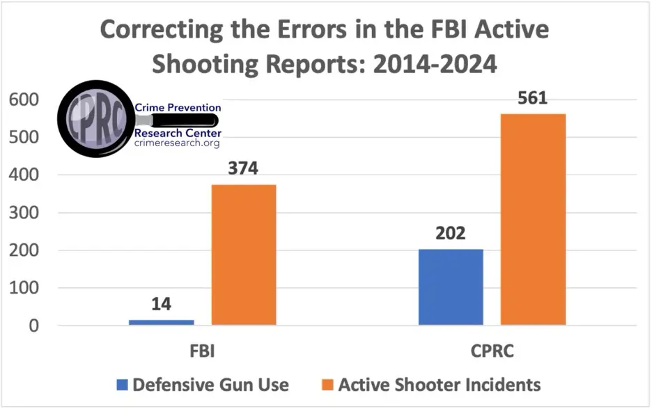 The FBI report compiled for the Biden administration for 2023 and 2024 contains worse errors. It asserts that armed civilians stopped none of the 72 active shooting cases it identified. The CPRC, by contrast, identified 121 active shooter cases – 45 of which were ultimately halted by armed civilians. Those incidents included eight cases that likely would have resulted in mass public shootings with four or more people murdered.