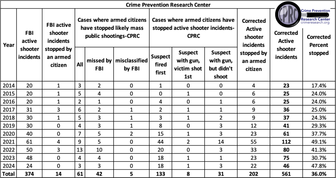 Massive errors in FBI’s Active Shooting Reports from 2014-2024 regarding cases where civilians stop attacks: Instead of 3.7%, the correct number is at least 36%. Excluding gun-free zones, it averaged over 52.5%. In 2024, it was 62.5%.