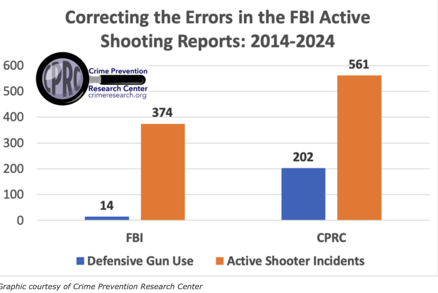 The Crime Prevention Research Center explained that the competing numbers are due to the FBI’s restrictive definition of active shootings and its misclassification of many.
