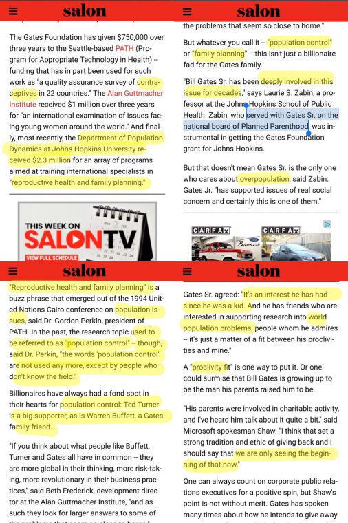 Salon - Bill Gates & his father’s connection to Planned Parenthood and their obsession with “population issues” - Bill Gates Jr’s friends who share same interests are Ted Turner and Warren Buffet…